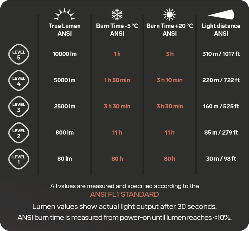 Silva uses the American lighting standard ANSI to communicate burning time. The burning time is measured from when the light is switched on until the brightness reaches 10% of the starting value. A headlamp that has 1000 lumens and a three hour burn time will give you 100 lumens after those three hours, according to ANSI.