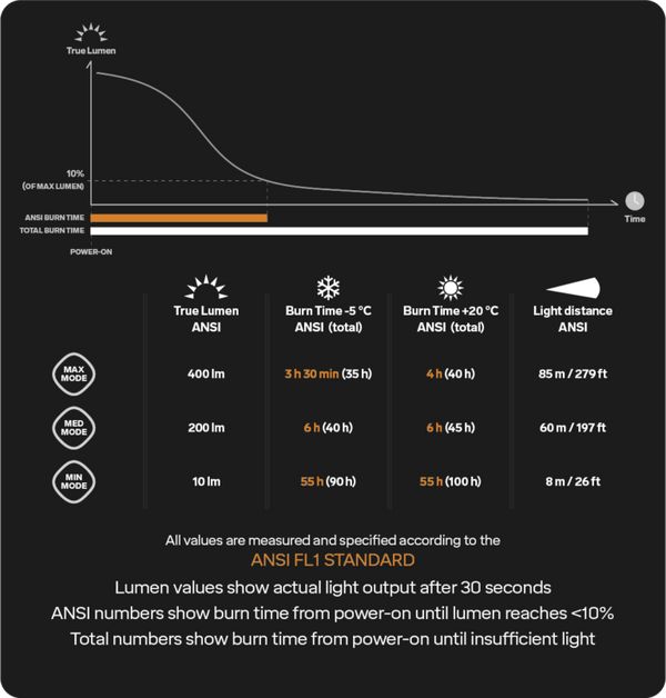 400 lm / 4 – 3.5 burn time / 85 m (279 ft) light distance